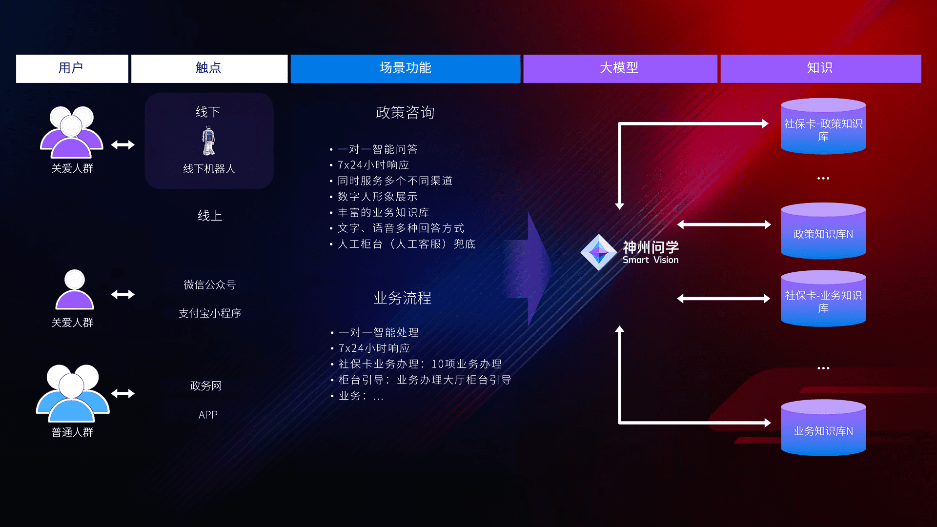 • 线上线下全覆盖:线上提供微信公众号、、、、支付宝小程序、、、、政务网、、、、app多种渠道,,与线下机器人形成完整服务体系。。