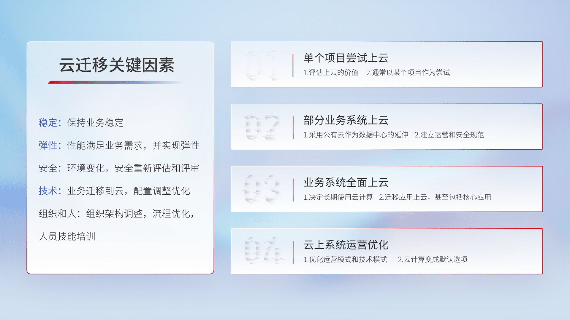 结合实际业务,,,,从规划设计、、、、云平台选型、、云原生改造、、数据迁移、、集成交付,,,迁移全过程为客户识别最佳上云路径,,做好风险识别管理,,,设计网络架构、、身份权限、、、安全审计合规、、、、操作审计、、、日志审计、、监控告警策略、、多站点容灾设计等,,,对云上基础设施进行整体规划,,,,提升IT治理水平,,,以满足弹性、、高可用、、高性能的需求。。。