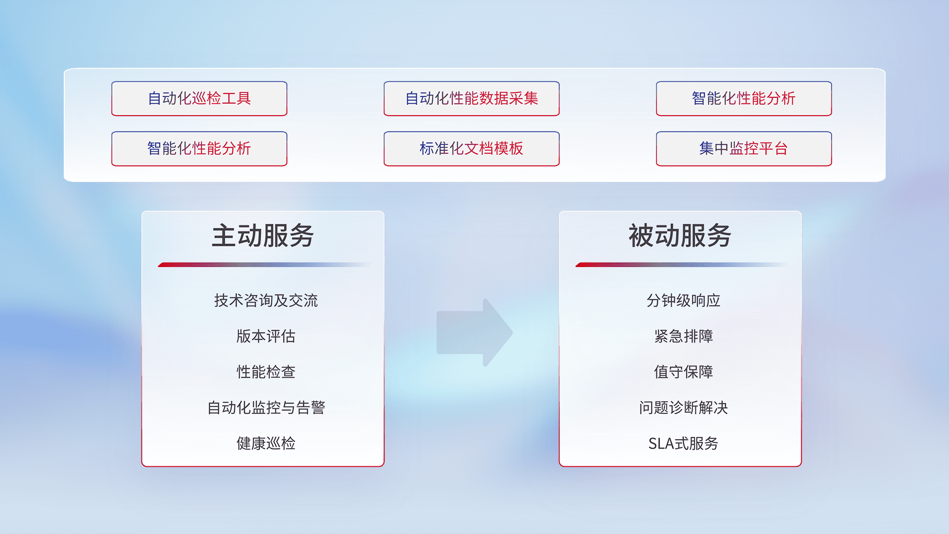 智能化工具和标准化文档,,保障服务质量,,,提供主动服务(包含技术咨询、、版本评估、、、性能检查、、、、自动化监控与告警、、健康巡检)和被动服务包含(分钟级响应、、、紧急排障、、、、值守保障、、、问题诊断解决、、、、SLA服务)。。。。